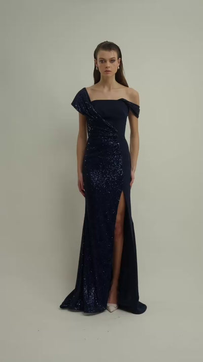 Chic and distinctive, this maxi dress features asymmetrical draped shoulders for a sculptural effect. Sparkling sequin detailing adds a glamorous touch, while the flowing silhouette creates effortless movement. A modern statement for any special occasion.