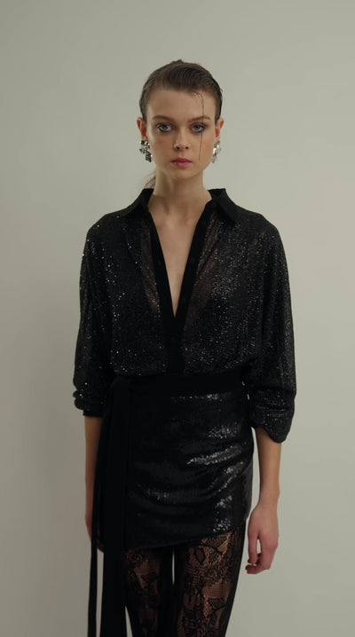 Sparkling with sequins, this asymmetric mini skirt features a graceful, flowy drape that adds movement and sophistication. A perfect balance of glamour and fluidity for standout evening looks.