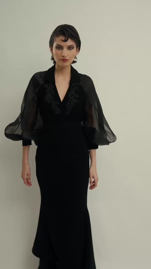 This stunning skirt features an asymmetrical design with a midi-length front that gracefully transitions into a dramatic maxi back queue. A perfect blend of modern edge and flowing elegance for unforgettable occasions.