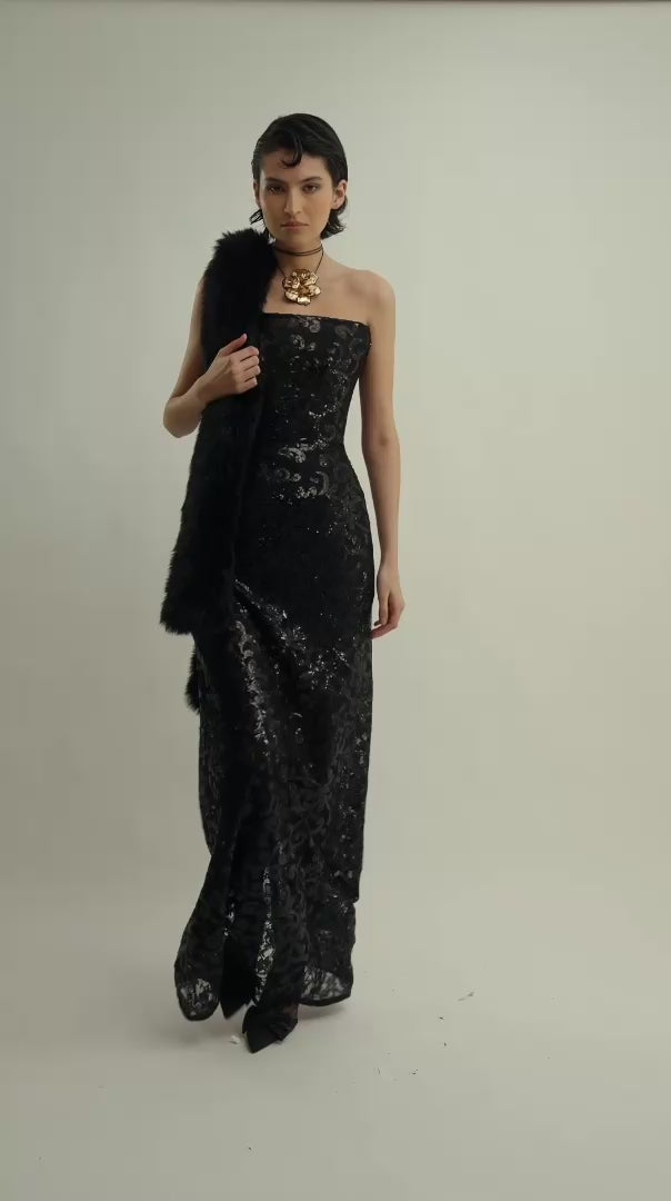 Sensual and sophisticated, this strapless black lace dress features a sheer maxi-length silhouette and an internal corset for sculpted support. Delicately embroidered details enhance its romantic allure, making it an unforgettable choice for evening elegance.