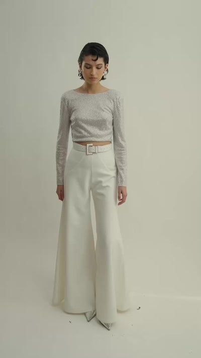 This crystal-embellished long sleeve top shines with subtle sparkle and sophistication. The graceful back cowl detail adds a touch of softness and movement, creating a stunning balance between glamour and elegance.