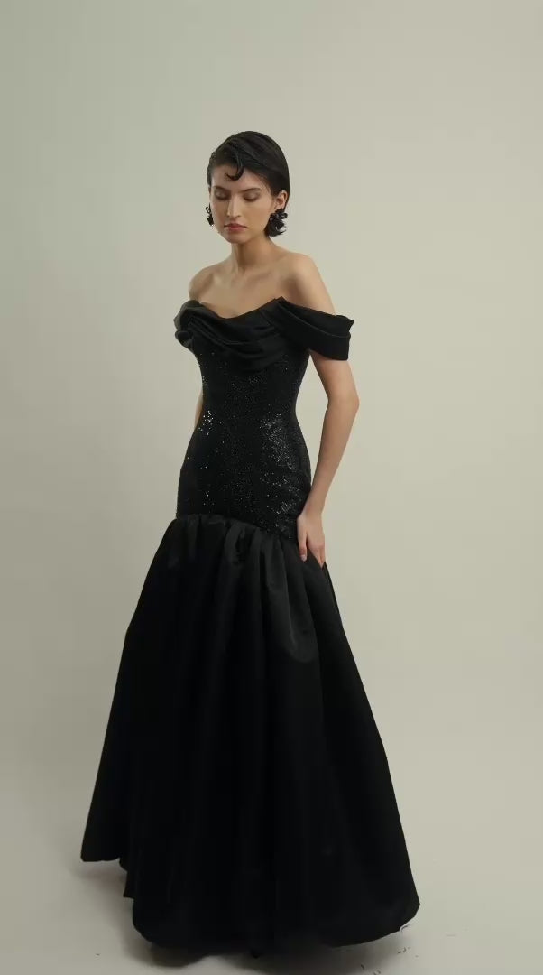 A textural dream, draped in sequins and stunning mikado, this maxi dress features a draped neckline and a bubble hem skirt, making it the perfect statement for quiet luxury and refined elegance.