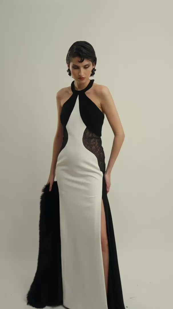 Striking in contrast and design, this halter neck dress features a black and white criss-cross bodice that sculpts the figure with modern elegance. Delicate lace inserts add a touch of romantic allure, blending structure with softness. Perfect for refined evenings with a bold twist.
