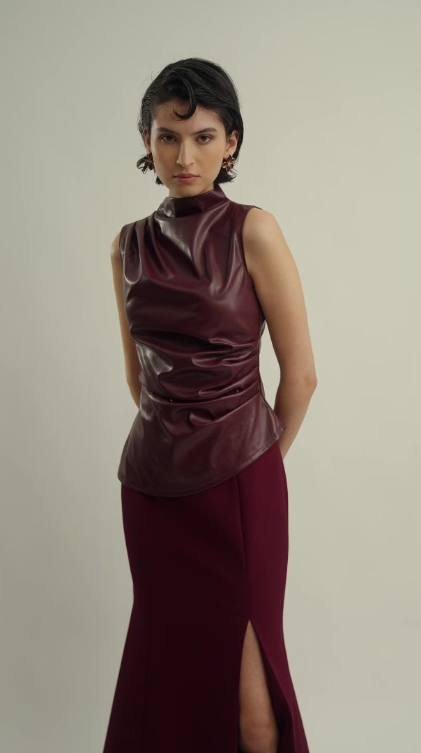 This high-neck sleeveless top combines edgy leather with graceful pleats for a striking contrast. Sleek and modern, it’s perfect for elevating any look with bold sophistication.
