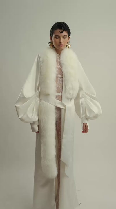 Embodying elegance and warmth, this coat features delicate Juliet sleeves and a luxurious Arctic Grace faux fur insert. A perfect blend of romantic detailing and cozy sophistication for chilly days with timeless style.
