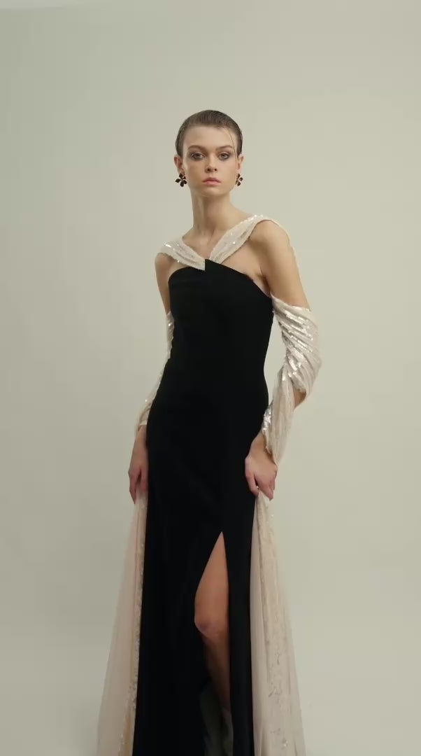 Gracefully sculpted, this black maxi dress features a fluid silhouette and a refined slit that adds subtle allure. Draped from the neckline, a moonlit sequin scarf shimmers with delicate brilliance, creating a timeless yet modern statement. An ode to understated glamour.