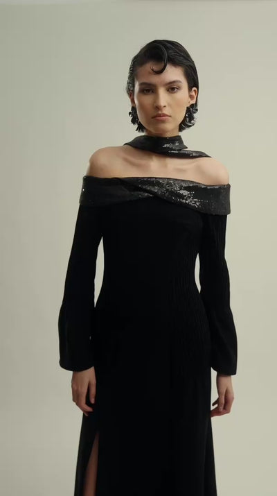 OFF-SHOULDER MAXI DRESS WITH SEQUINS AND LONG SLEEVES