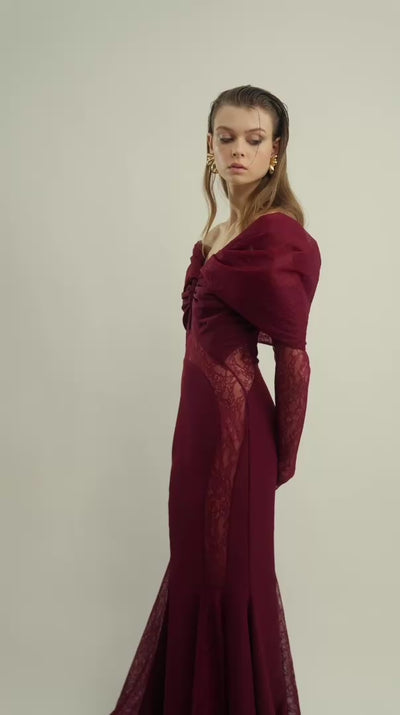 Elegance redefined, this maxi dress features a striking mermaid silhouette with delicate lace inserts and long sleeves. A keyhole detail adds subtle allure, while the detachable lace shoulder drape offers versatile drama. Perfect for making a graceful statement.