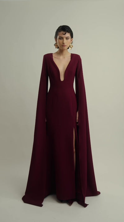 Flowing with quiet power, this maroon maxi dress features a deep V-neck and strong, padded shoulders. Floor-grazing waterfall sleeves add graceful movement, balancing structure with softness. A refined statement for any occasion.