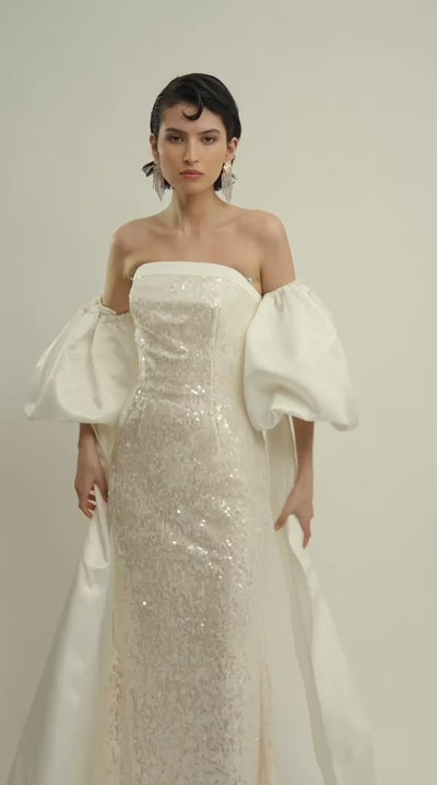 Radiating modern glamour, this strapless white mermaid gown is fully adorned in sequins for a luminous finish. The sculpted silhouette is paired with voluminous cascade sleeves, adding a touch of drama to its sleek elegance. Designed to dazzle.