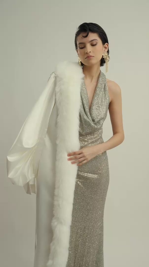 Seductive and refined, this sheer cowl neck maxi dress stuns with its open back and crystal embellishments. A thigh-high slit adds a bold edge, while the fluid silhouette drapes effortlessly. Made to sparkle and leave a lasting impression.