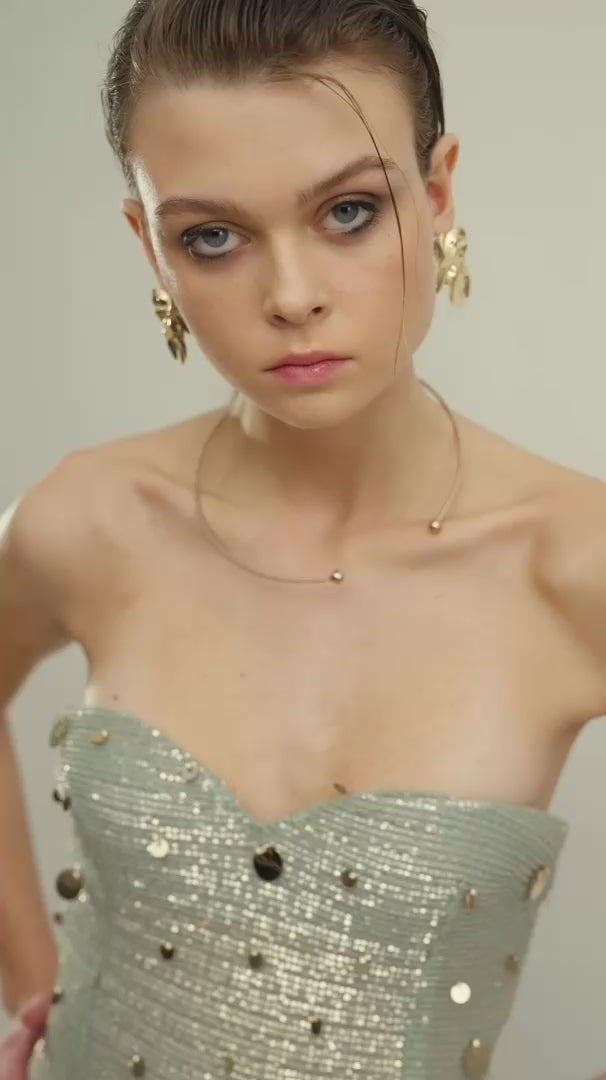 A vision of celestial grace, this strapless crystal gown is sculpted in a mermaid silhouette to flatter and enchant. Golden ivy and leaf embellishments wind delicately across the design, evoking a starry serenity with every shimmer. A luminous choice for ethereal evenings and unforgettable entrances.