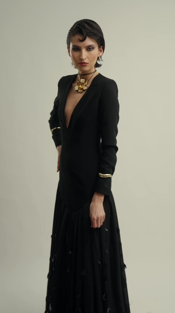 Tailored with precision, this suited basquine chemisier features a defined V-neckline, long sleeves, and structured padded shoulders for a powerful silhouette. Black leaf embroidery adds a touch of intricate elegance, blending sharp tailoring with delicate detailing. A timeless statement of modern femininity.