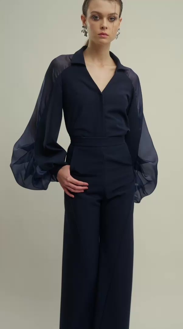 These high-waist trousers feature a subtle wide-leg cut for a relaxed yet tailored look. Perfectly balancing comfort and elegance, they’re ideal for versatile day-to-night styling.