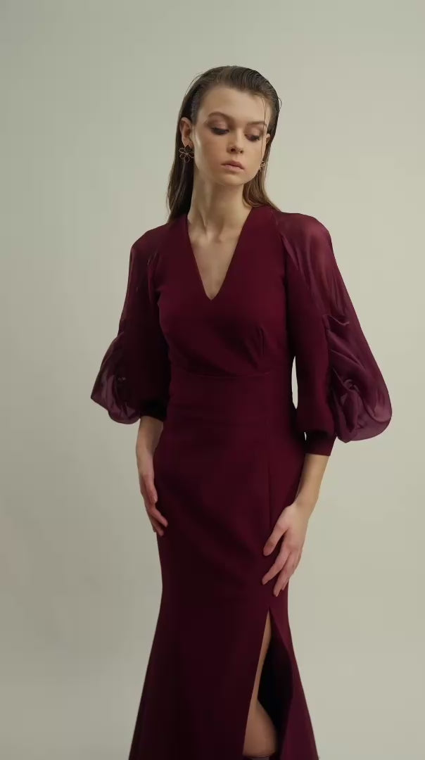 This maroon blouse features a flattering V-neckline and romantic Juliet sleeves, combining classic elegance with a touch of softness. A versatile piece that effortlessly elevates both day and evening looks